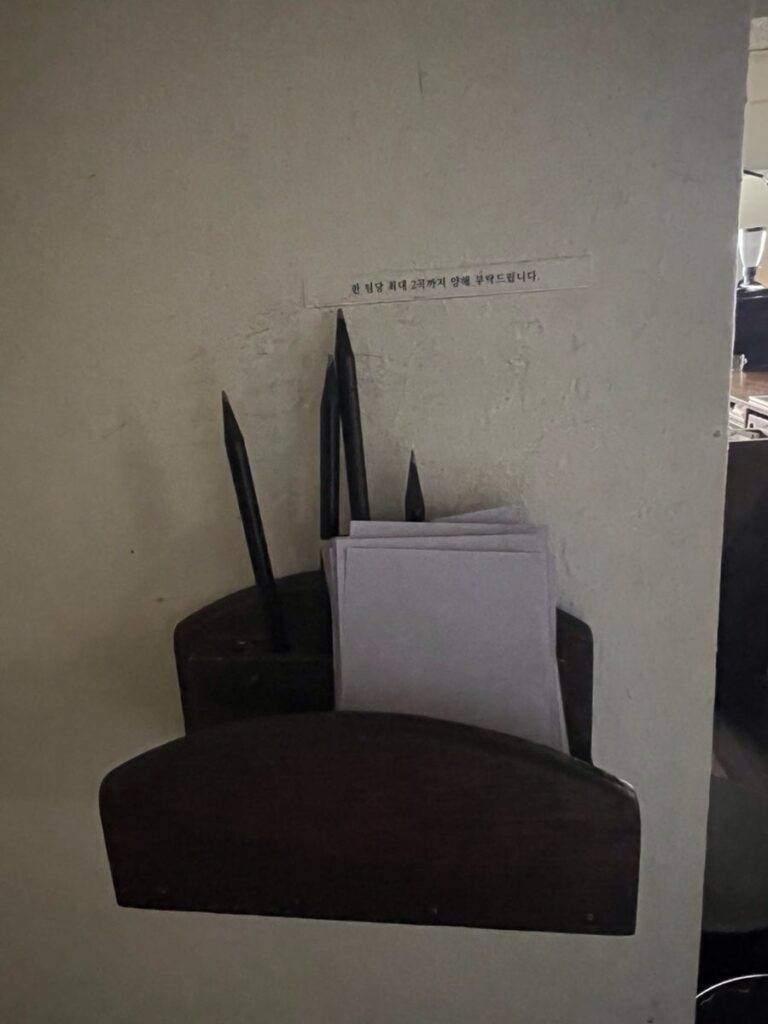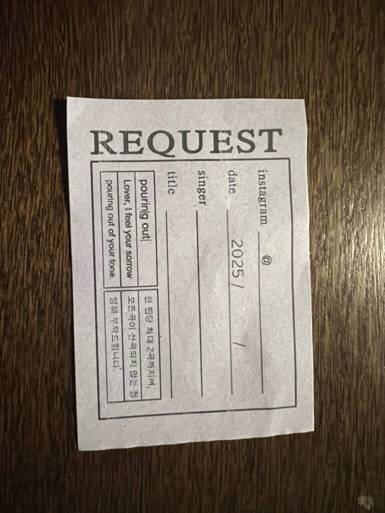 The café is famous for its “Request Notes.” You can write down your favorite tracks or a short message, and if it fits the mood of the day, the staff will add it to the playlist. It creates a beautiful, silent connection between the space, the music, and the guests.