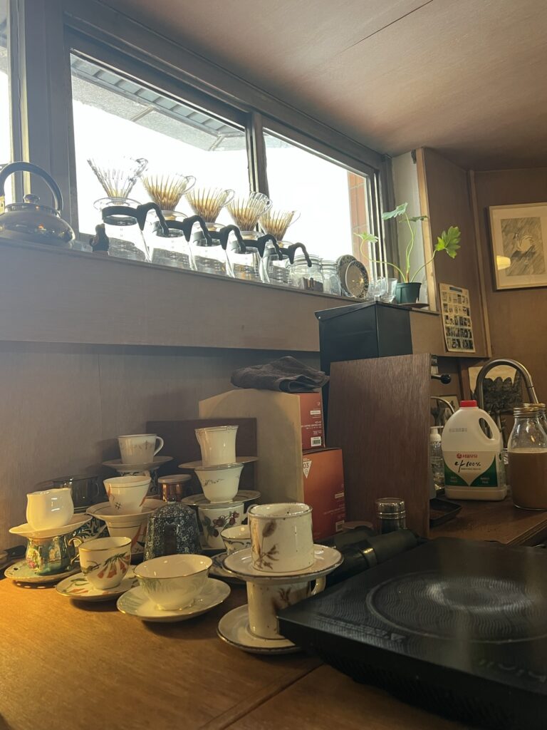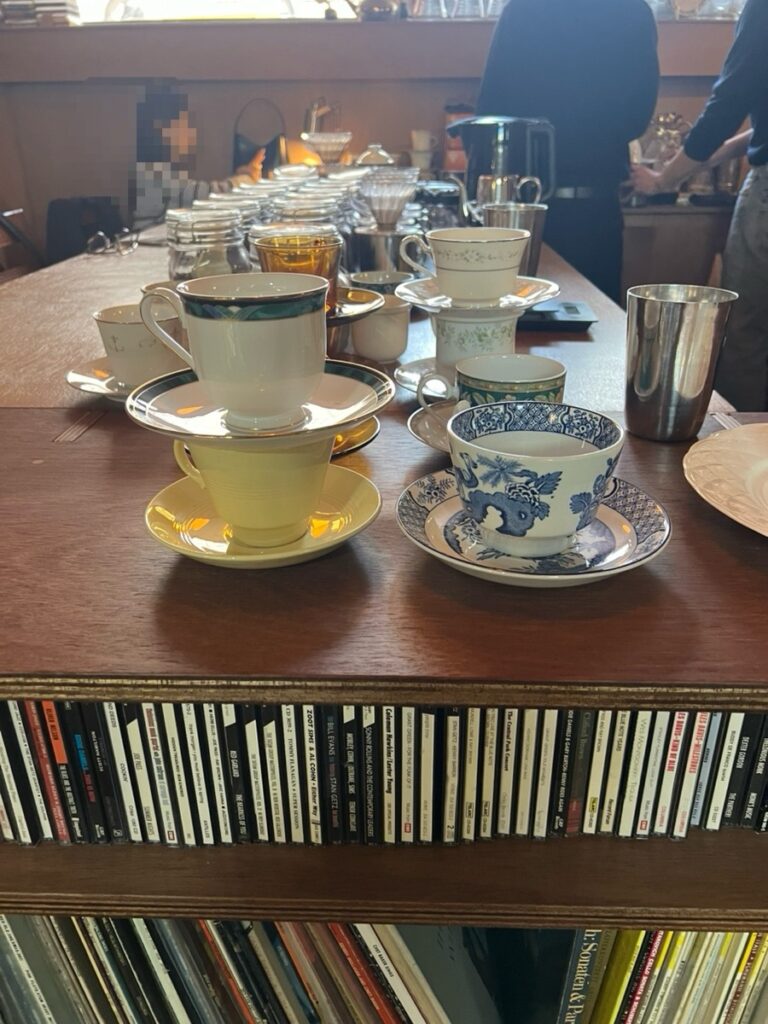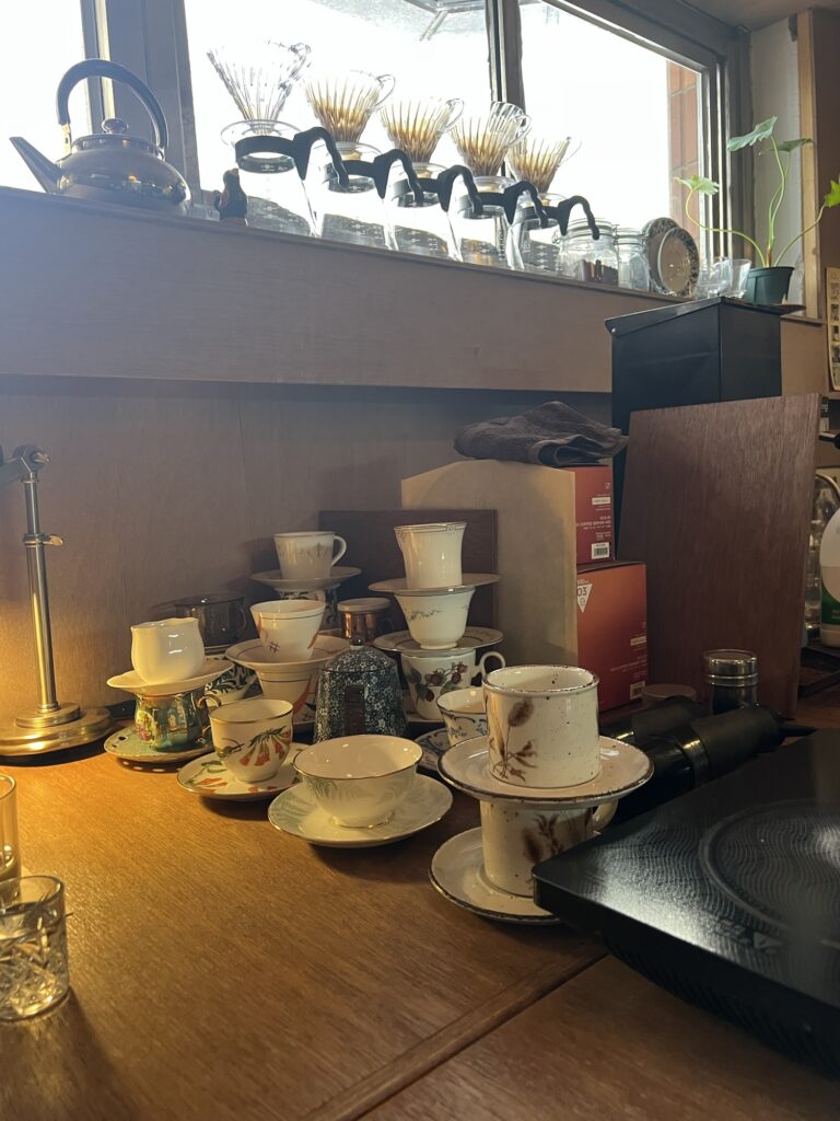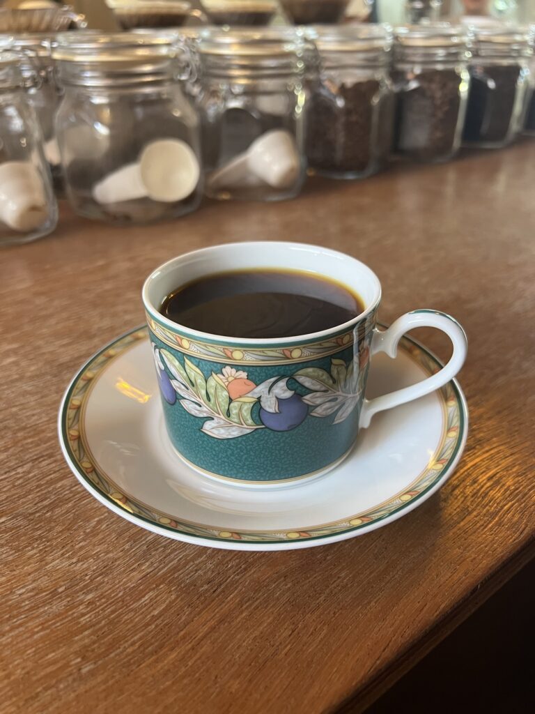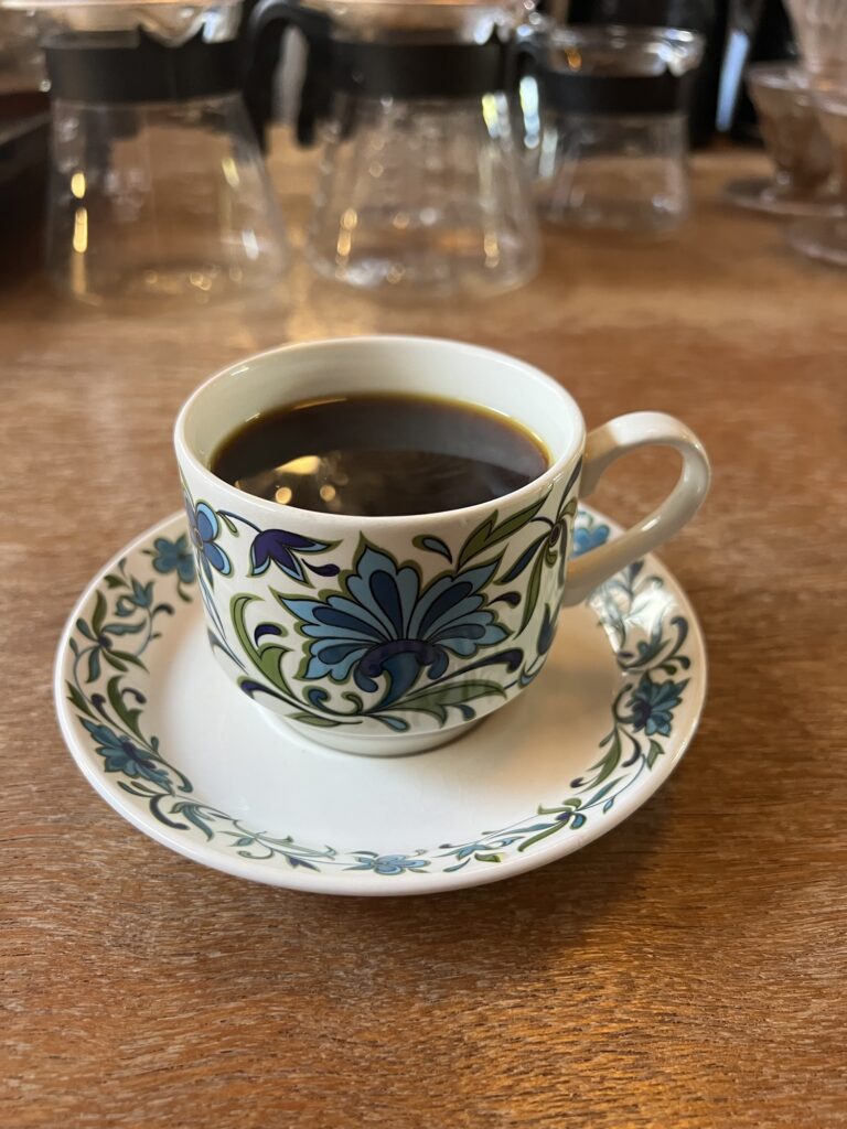 The coffee served in an antique coffee cup is really delicious.