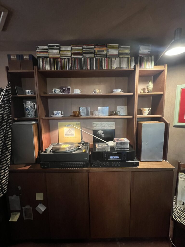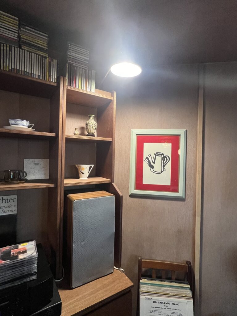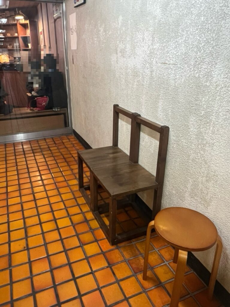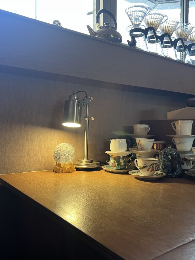 The interior is a beautiful mix of vintage wooden furniture and soft, warm lighting. It’s small, quiet, and incredibly intimate.